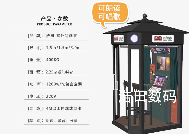 朗讀亭伴隨著央視中央電視臺開年力作,大型文化情感節目《朗讀者》的籌劃應運而生、朗讀亭外觀古樸、比普通的電話亭要稍微略大一些,上面寫著大大的“朗讀亭”字樣,24小時開放。內部工作臺、電源、燈飾、插座及一套完整的錄音設備。廣州浩田為客戶提供室外朗讀亭加盟渠道,為您解答朗讀亭價格費用、朗讀亭免費使用嗎、室外朗讀亭怎么使用等問題。