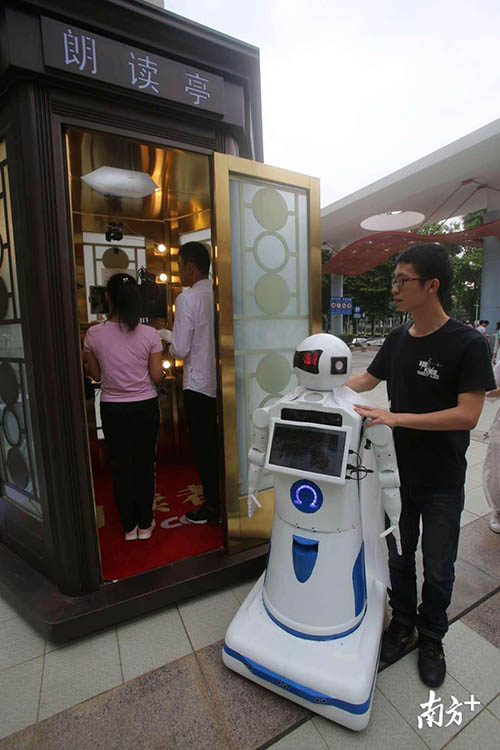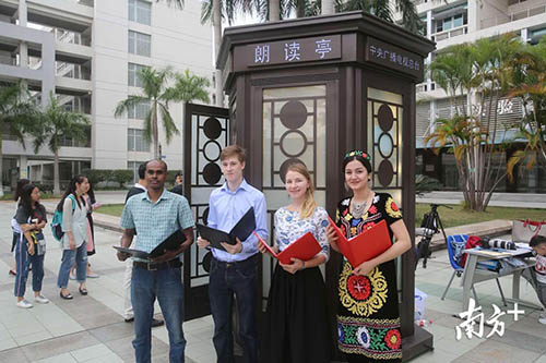 來到朗讀亭的有華工離體老教授,現任校領導,中外在校生,華工研制的機器也進亭朗讀了。