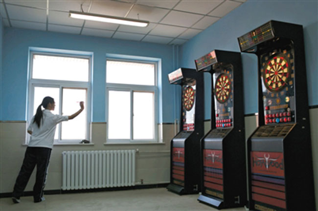 可能在一些學校的角度覺得,學生的功課那么忙,玩飛鏢是不是不務正業,57中卻破天荒地在學校成立了飛鏢隊,甚至把飛鏢運動引入選修課程中,成為全國首位開設飛鏢課程的學校。當其他學校還在為學生的加強眼保健操的時候,57中已經把練習飛鏢作為保護學生眼力,緩解眼部疲勞的途徑。到現在為止,飛鏢運動都已經在學校駐足三年,飛鏢機已經普及開來,一字排開,成為校園大禮堂上的一道倩影。