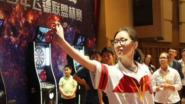 訓練場上,57中一名女生右腿略彎支撐身體,橫向站立,側身、瞄準、擲鏢,投中,順暢地完成了這一系列動作。接著第二次,第三次…… 在這間教室內,78電子飛鏢機,每個鏢靶都已經插滿了針眼,可想訓練之艱苦。這門選修一直吸引了很多學生參加,但是只有基礎的學生,練習成績過關的學生,才能成為學校運動隊一員,代表學校參加比賽?;蛟S不久將來,在國內外飛鏢比賽賽場上,會更多一些天賦爆棚的新生代選手。
